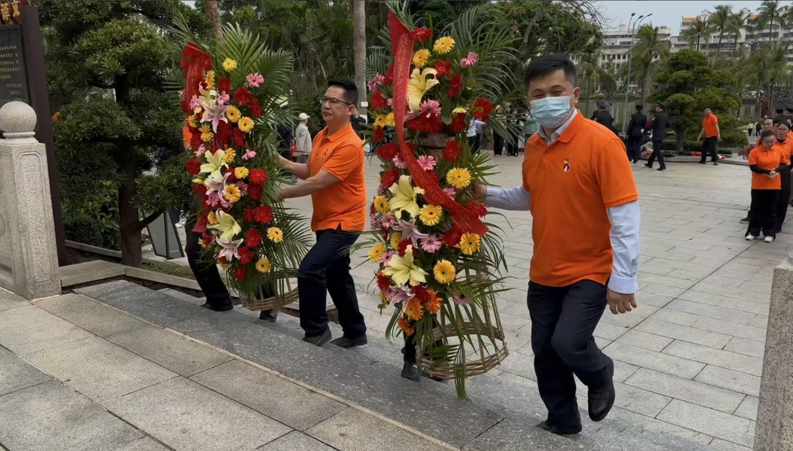 经过一段时间的等待才轮到我们。我们首先向烈士敬献花篮,花篮缎带上写着“为坚持琼崖革命23年红旗不倒牺牲的烈士们永垂不朽!”“为解放海南岛渡海牺牲的烈士们永垂不朽!”鲜艳的花篮寄托我们对革命先辈的崇敬和哀思。